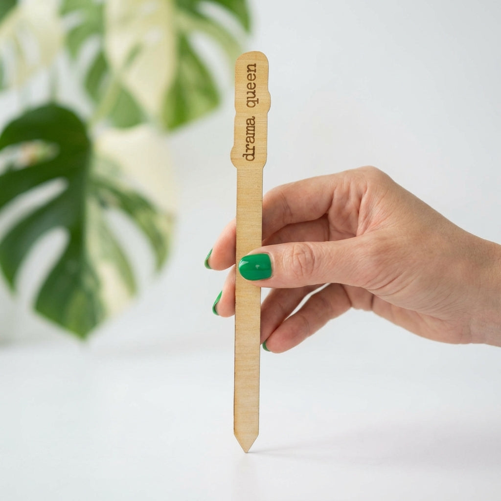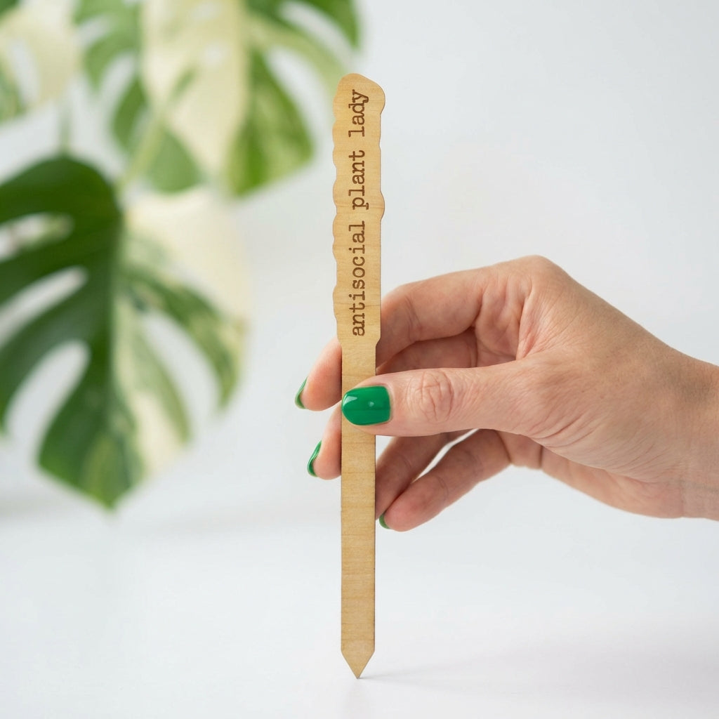 These locally made wood plant stakes are the perfect way to add humor, encouragement, and good vibes to your favorite leafy friends. Each stake is laser cut from 3mm cherry plywood, finished with a clear protective seal, and designed to pop right into your pot —no green thumb required.