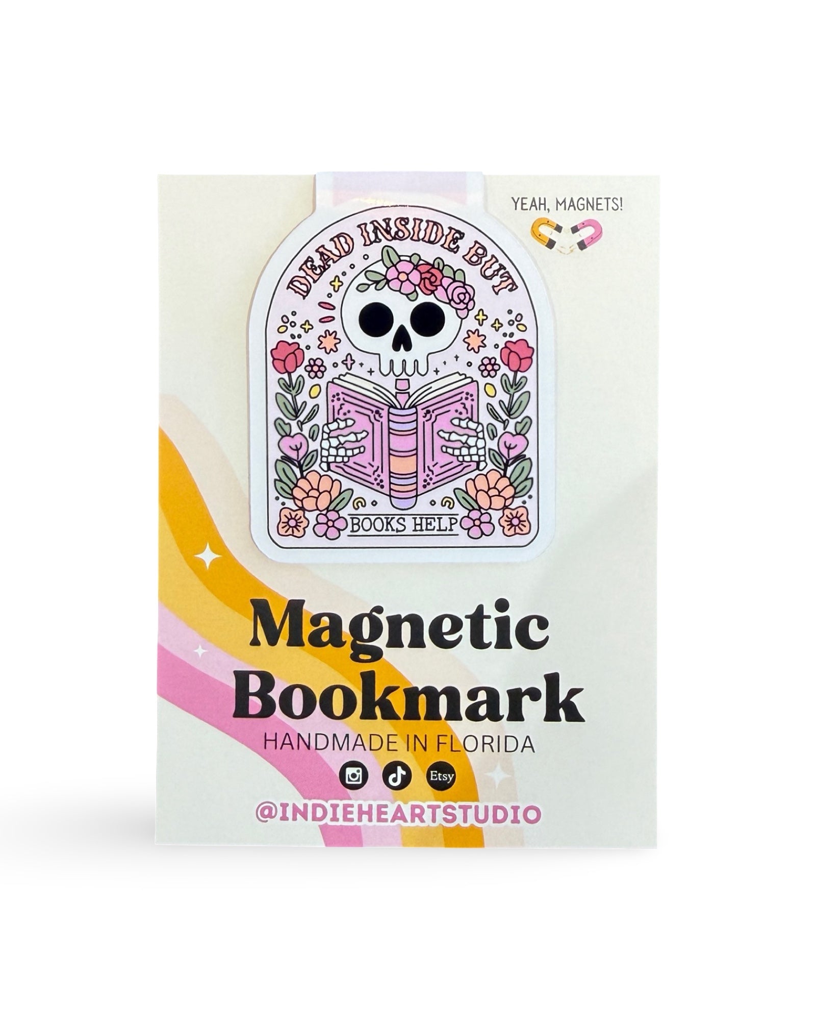 Mark your place in style! This magnetic bookmark features a cozy-goth design that reads “Dead Inside But Books Help” with a floral skull reading an open book. It’s handmade by Indie Heart Studio, a small business based in Florida. Designed to gently clip over your page, it stays put without damaging your book.