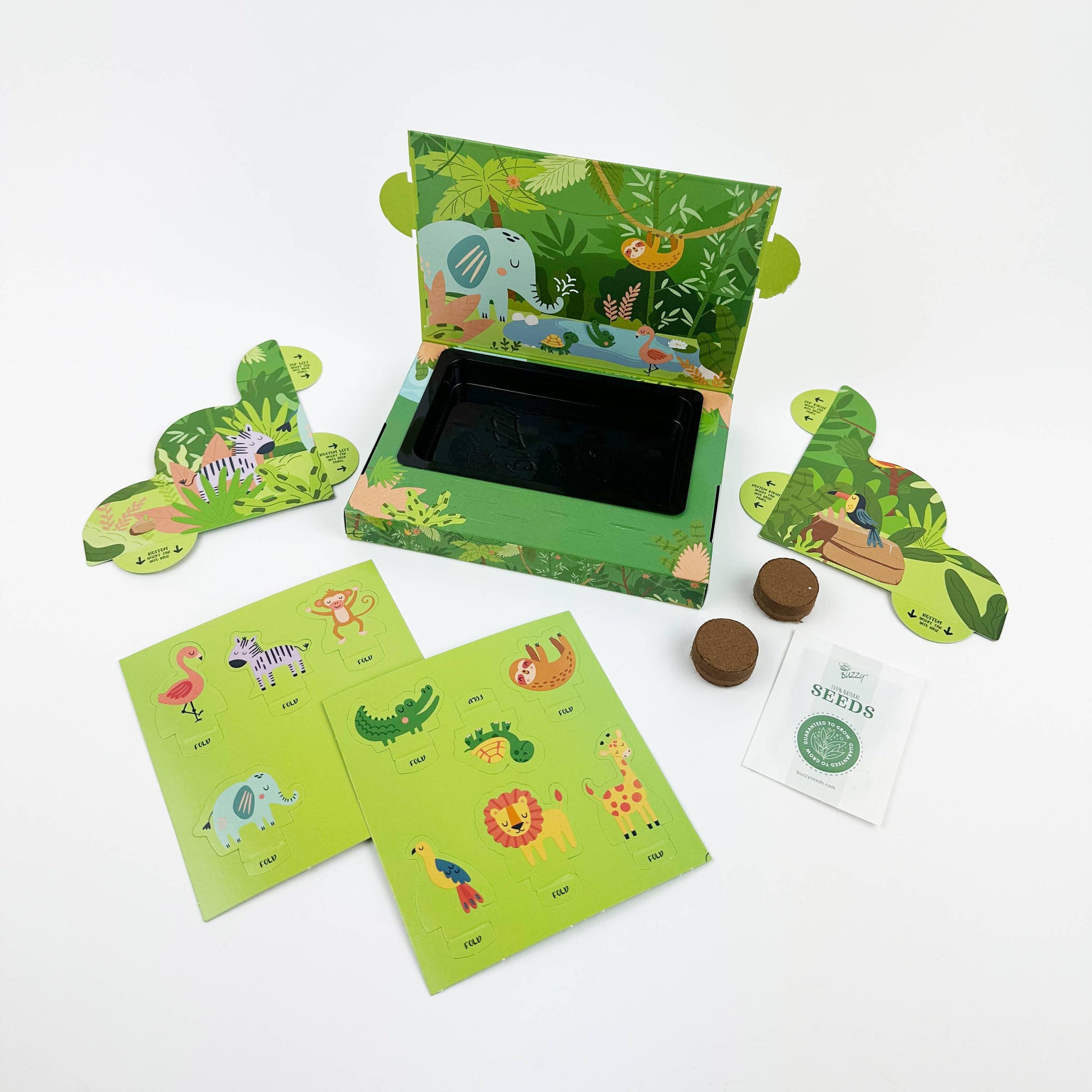 Each kit includes everything needed to get started: a tray, pop-up paperboard garden, growing medium, seeds, 11 pop-out jungle animal characters, and instructions. In about a week, the garden fills in with bright green growth, creating a fun display that doubles as an imaginative play scene.