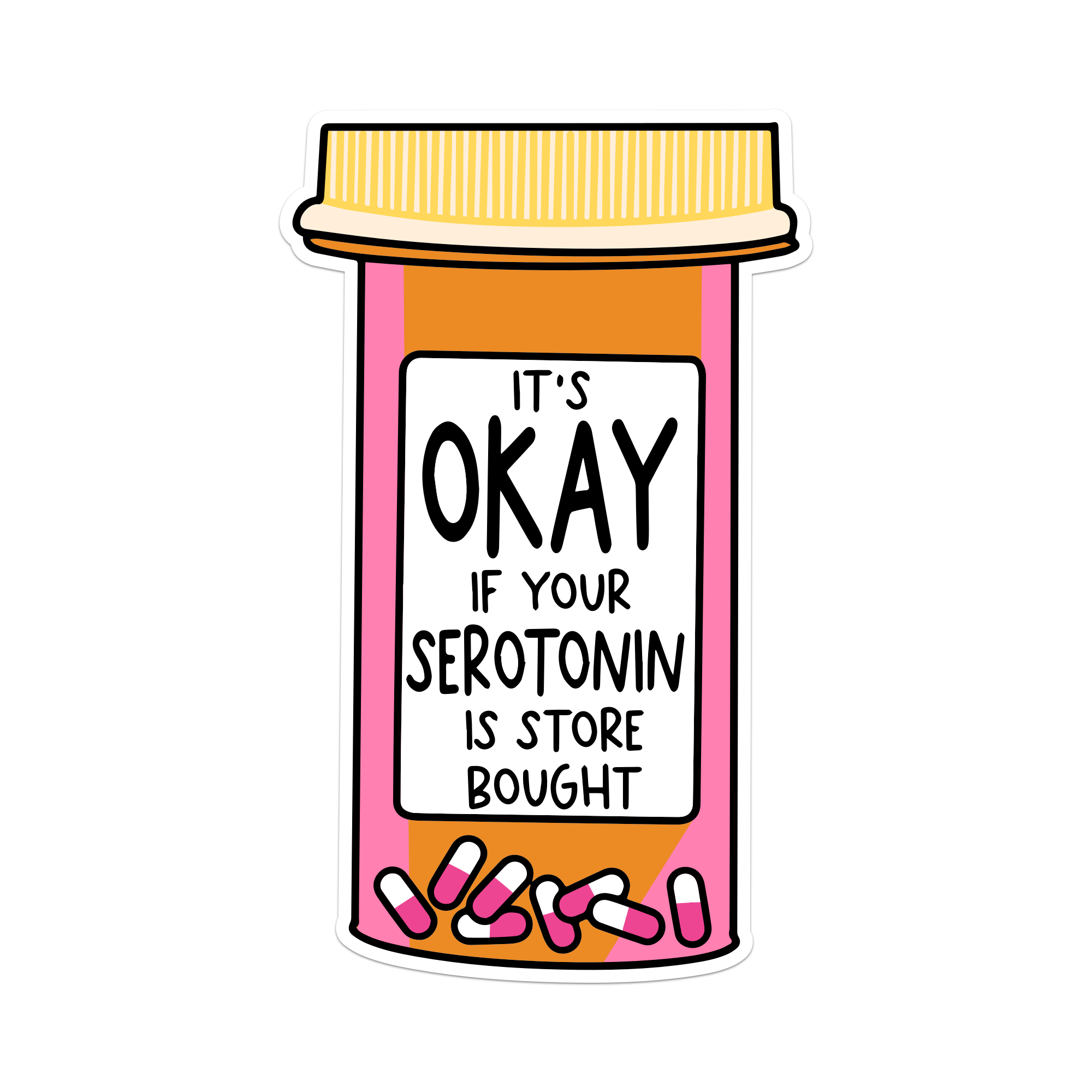 This funny, relatable vinyl sticker features a pill bottle illustration with the phrase “It’s okay if your serotonin is store bought.” A gentle reminder that there’s no wrong way to feel okay — and humor helps.