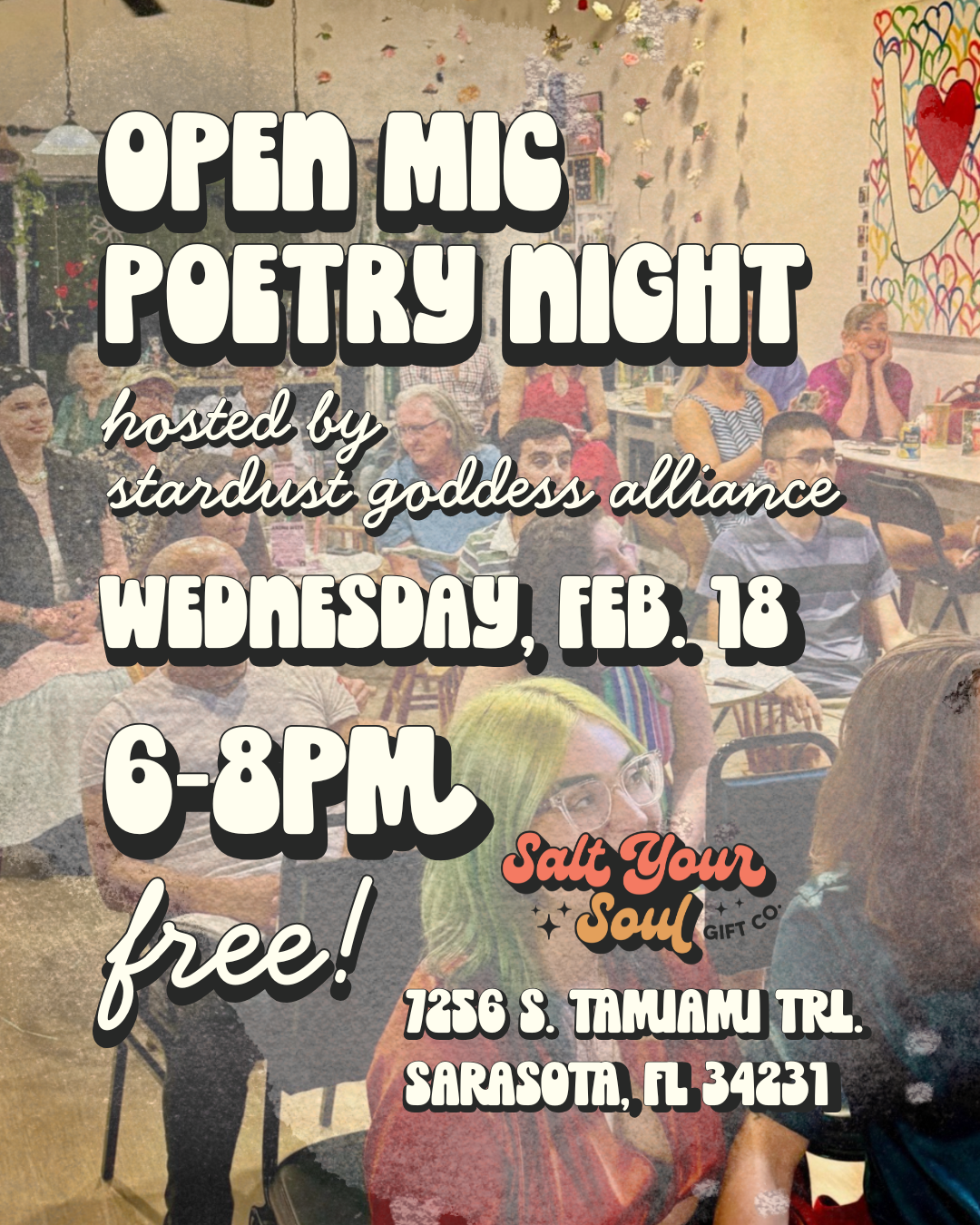 Step into a cozy, plant-filled space and let your words flow. Join us for an intimate Open Mic Poetry Night, hosted by the wonderful Stardust Goddess Alliance — a collective of local gals creating heart-centered community events around Sarasota.