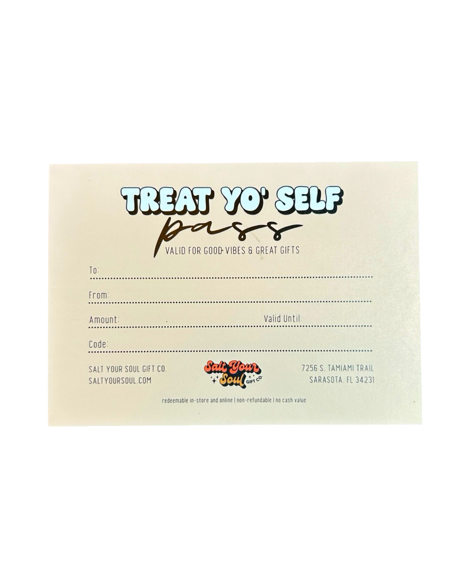 If you want a physical, hold in your hand and give to a bestie gift certificate then you are in the right place!! If you just want a digital gift card that gets emailed to you/receiver, then go here: Salt Your Soul Digital Gift Cards