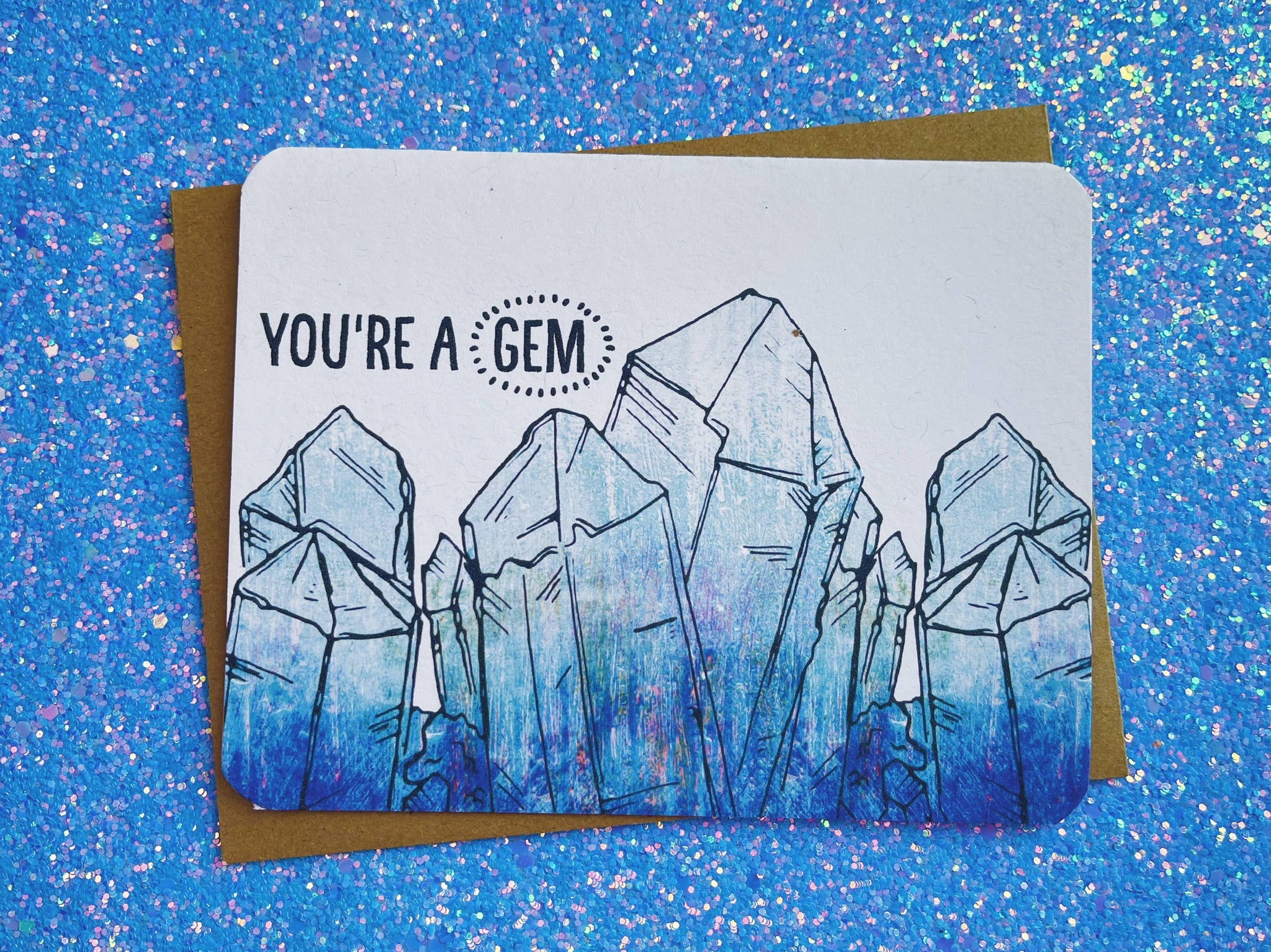 This A2 greeting card features a crystal illustration with the message “You’re a gem.” A thoughtful way to show appreciation, celebrate someone special, or brighten someone’s day for no particular reason.